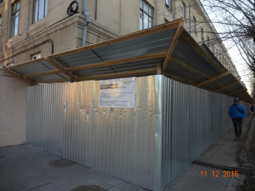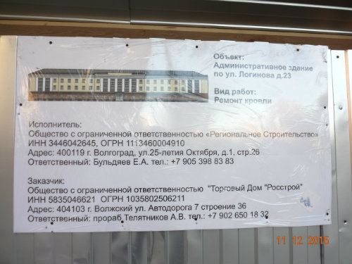 В орган местного самоуправления не поступали заявления от физических и юридических лиц о выдаче разрешения на строительство (реконструкцию) объекта капитального строительства по адресу: ул. Логинова, 23. По имеющейся в администрации городского округа - город Волжский информации от собственника земельного участка и здания, расположенного на нём, выполняется ремонт кровли. Ограждение по периметру здания выполнено в связи с ремонтными работами. В адрес правообладателя здания направлено предписание по размещению информационного щита в срок до 11.12.2015.