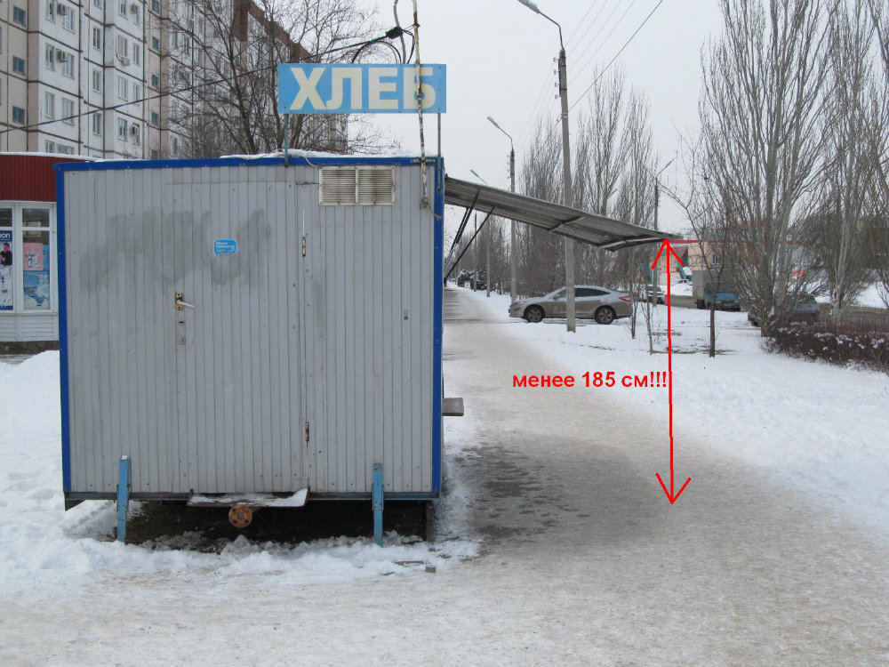 Собственнику тонара, расположенного в районе земельного участка по адресу: ул. Дружбы, 52, г. Волжский, Волгоградской области направлено письменное уведомление об установке козырька на безопасную высоту не менее чем на 2 метра от земли.