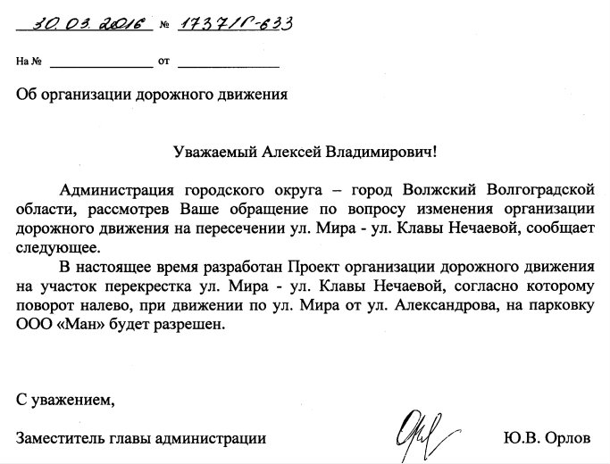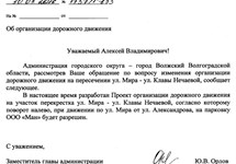 Разработчиком Проекта организации дорожного движения на участок перекрестка ул. Мира - ул. Клавы Нечаевой является ООО «Ман». В настоящее время Проект находится на согласовании в ОГИБДД УМВД России по г. Волжскому и Администрации городского округа – город Волжский. Об утверждении Проекта вам будет сообщено дополнительно.