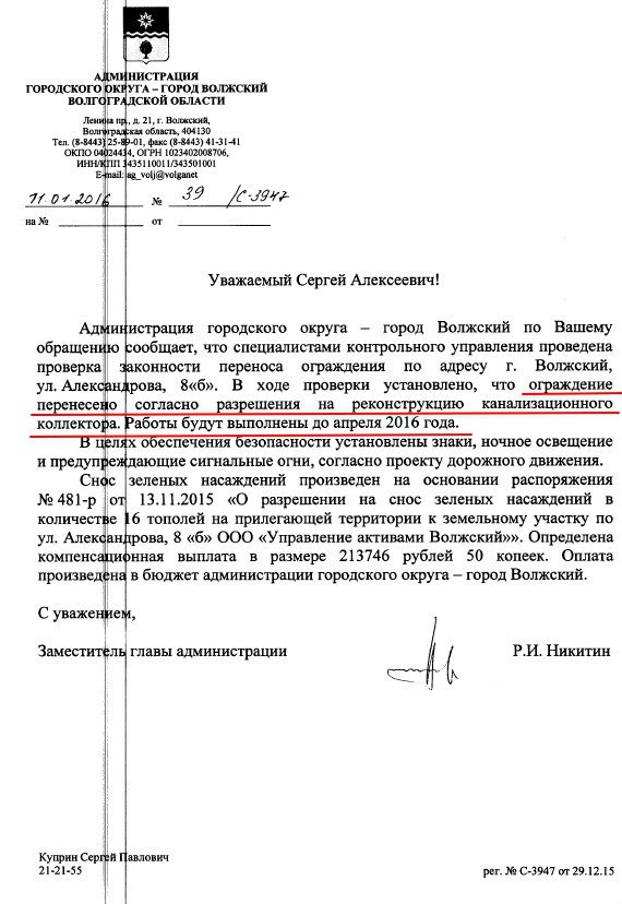 В адрес инспекции государственного строительного надзора Волгоградской области (далее – Инспекции) направлено запрос о предоставлении информации по выполнению строительства линейного объекта по указанному адресу. В настоящее время ответ из Инспекции не поступил. Вместе с тем администрация городского округа сообщает, что согласно действующему законодательству застройщик имеет право продлить действие разрешения на строительство объекта капитального строительства на срок, необходимый для завершения его строительства.