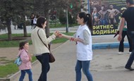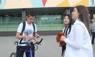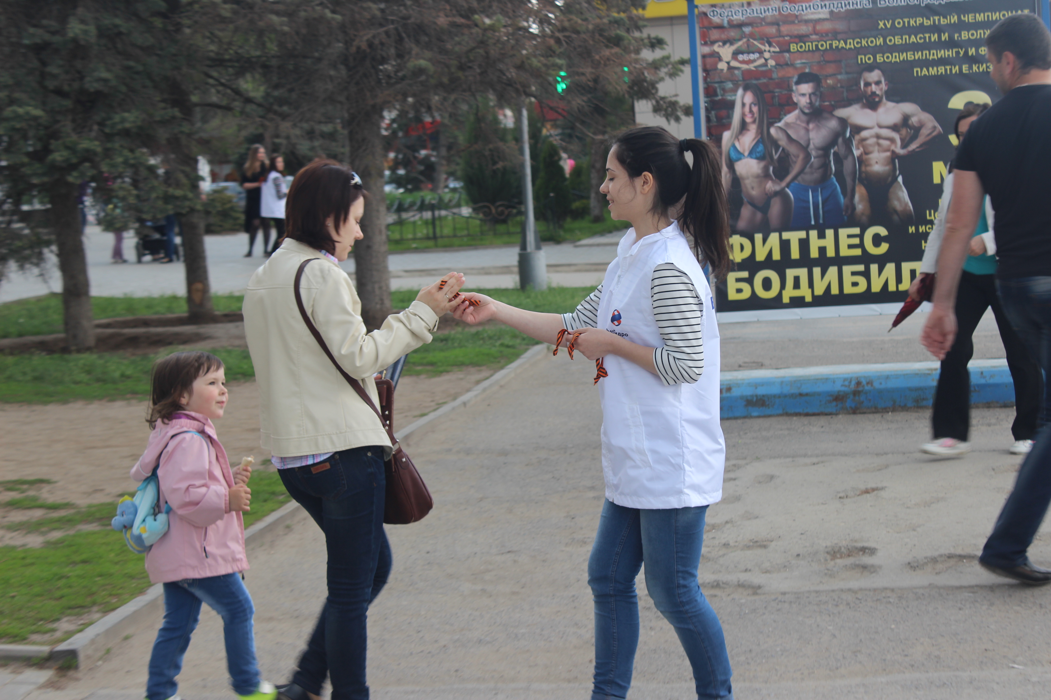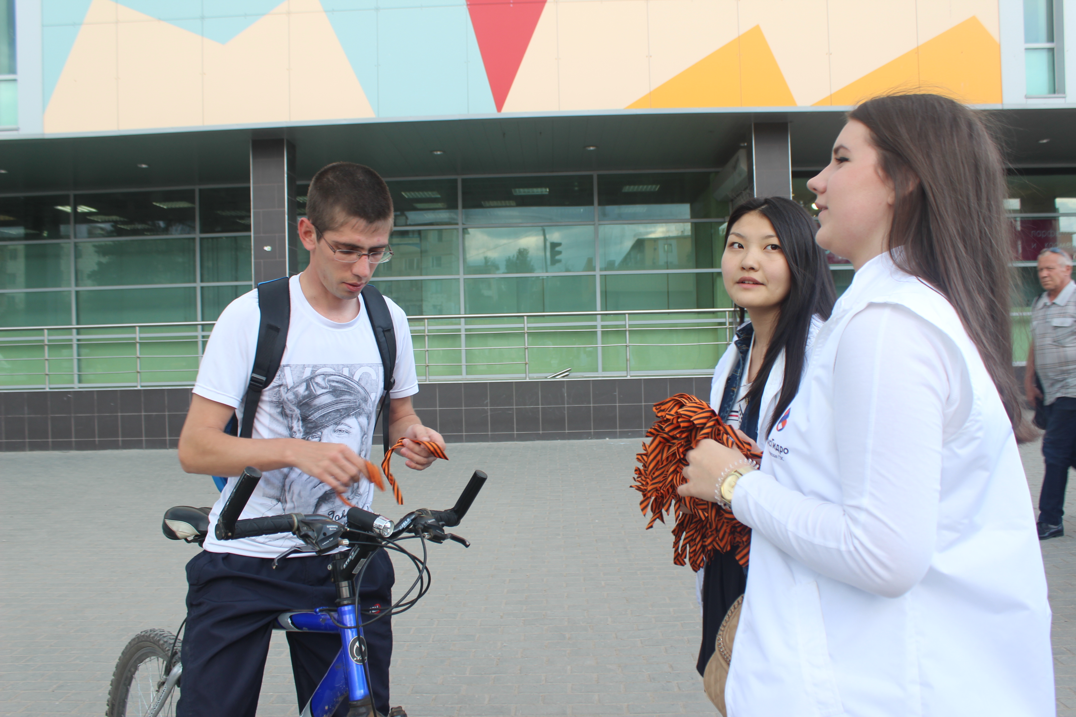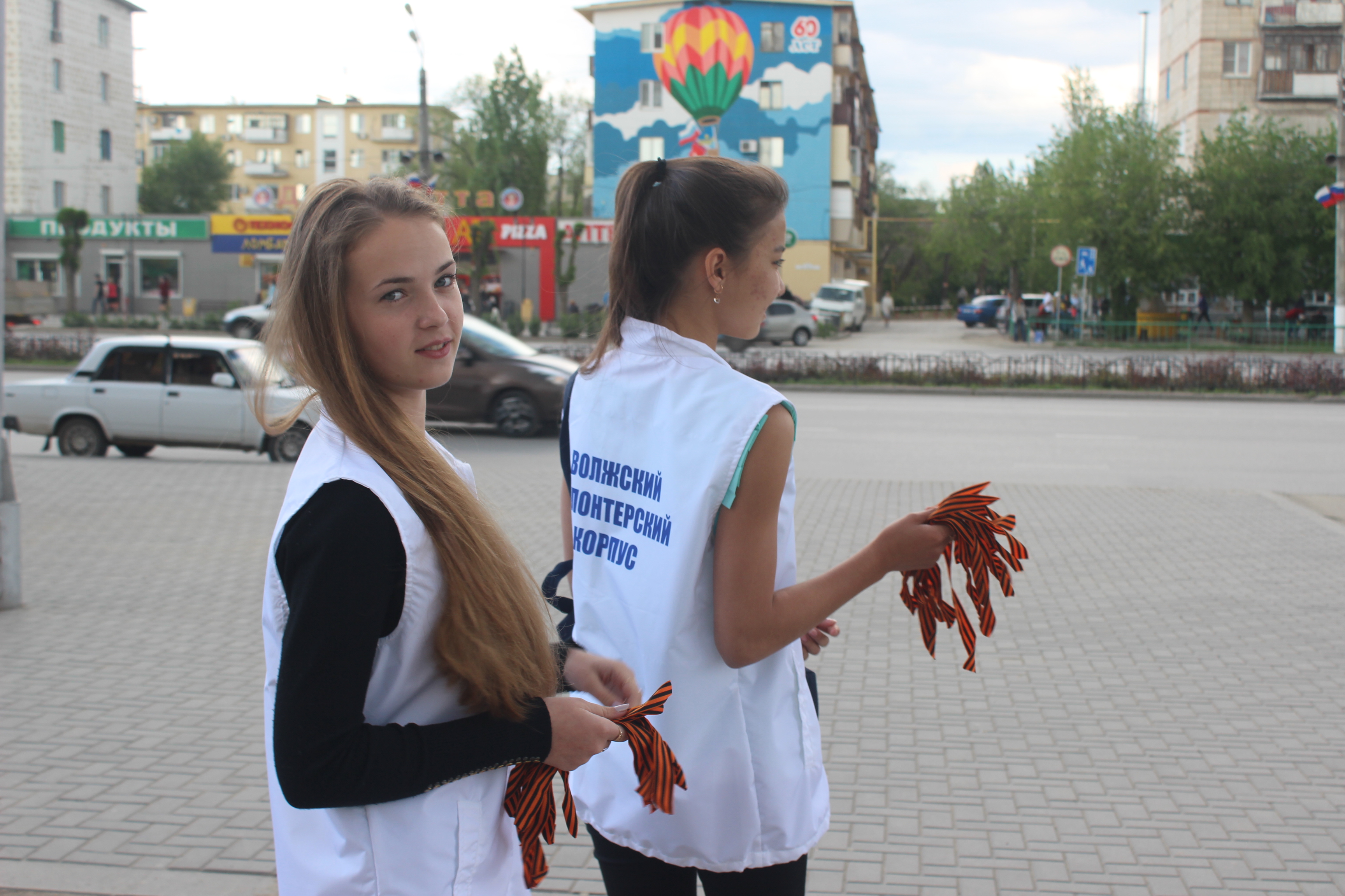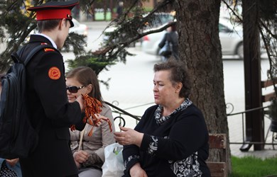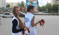 Волонтеры раздавали Георгиевские ленточки на площади Ленина около магазина «ЦУМ» и на территории рядом с торговым центром «Гермес» в 16 микрорайоне. Ребята поздравляли прохожих с наступающим праздником.