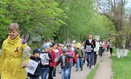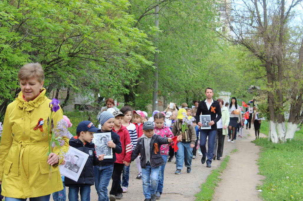 110 ребят из старших и подготовительных групп вместе с педагогами и родителями несли цветы и портреты ветеранов, участников Великой Отечественной войны. Колонна прошла из 8 микрорайона в 9-й – к Обелиску. Здесь ребятам рассказали о событиях тех военных лет, а затем дети возложили цветы.