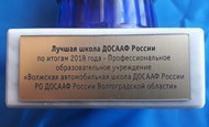 Бюро Президиума Центрального совета Общероссийской общественно-государственной организации «Добровольное общество содействия армии, авиации и флоту России» признала Волжскую автошколу ДОСААФ лучшим профессиональным образовательным учреждением в системе ДОСААФ России. Организация награждена памятным кубком и адресным шильдом.